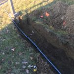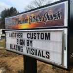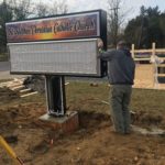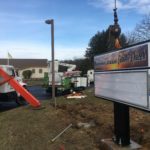 This sign is a custom fabricated 4 ft. by 8 ft. changeable letter sign cabinet with vandal cover and 3 lines of 6 inch changeable text. This sign was a single post mount to meet township code, so extra design and engineering went into assuring that it will handle hurricane force winds. The footing was 2 ft. by 2 ft. by 5 ft. deep. It has a re-enforced #5 rebar cage with j-bolts. The sign is plate mounted with electric spanning 15 feet to the nearest light post which will allow the sign to be turned on with the same timer as the parking lot lights. The vandal cover insures no funny business with your sign letters and the internal illumination makes it look great at night.